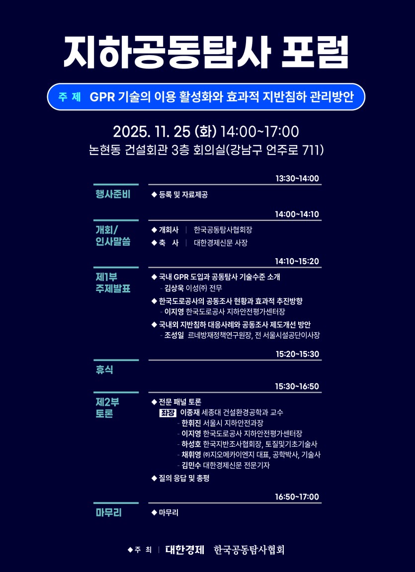 GPR 기술의 이용 활성화와 효과적 지반침하 관리방안을 주제로 2025.11.25 건설회관(강남구 언주로 711)에서 개최된 포럼의 발표자료를 아래에 올립니다.